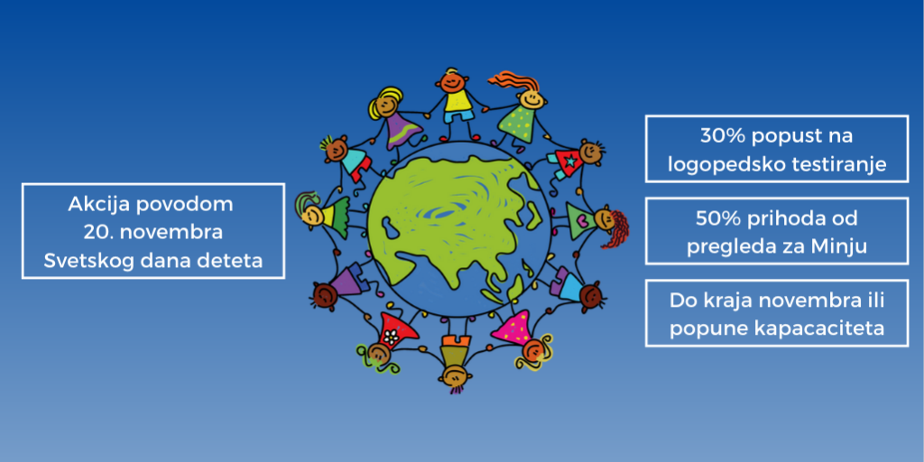 Tim povodom, a u najboljem interesu dece, do kraja novembra (ili popune kapaciteta) dajemo 30% popusta na sva logopedska testiranja. Iskoristite jedinstvenu priliku da proverite govorno-jezički razvoj vašeg deteta. Podsećamo da smo smo 10. novembra pokrenuli akciju Minjin novembar, povodom koje će 50% od svih prihoda biti usmereno u fond za lečenje naše male sugrađanke Minje Matić, čije osnovno pravo za život, opstanak i razvoj su ugroženi zbog nehumanih troškova lečenja (2,4 miliona dolara).