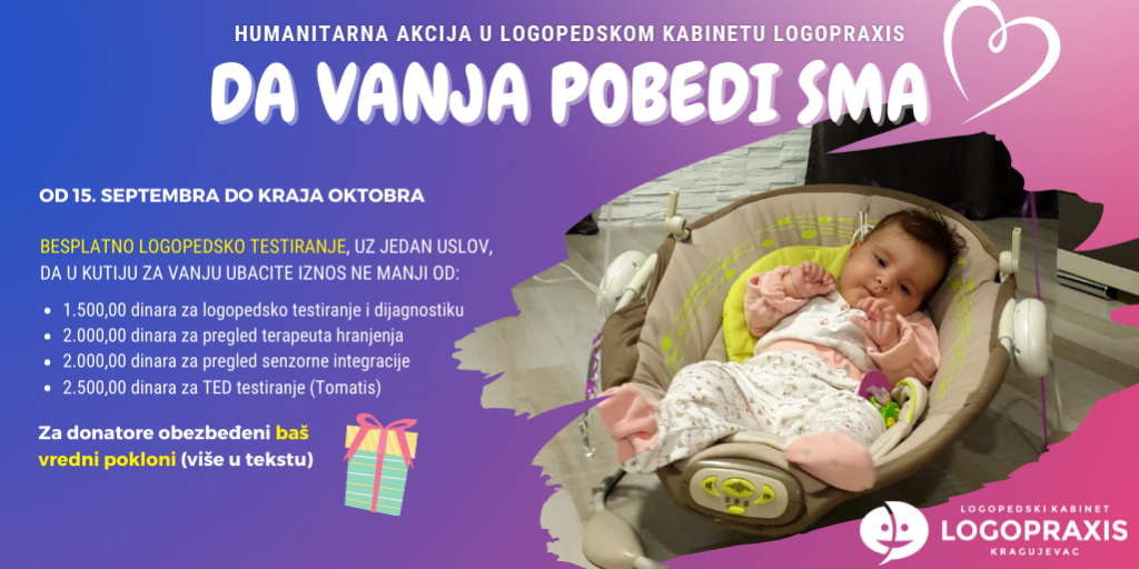 Od 15. septembra, pa do kraja oktobra, Logopedski kabinet Logopraxis organizovaće novu humanitarnu akciju, ovoga puta za lečenje četvoromesečne bebe Vanje Malović, koja boluje od spinalne mišićne atrofije, Tip 1, a za čiji lek je potrebno hitno prikupiti ogroman, u evrima milionski novčani iznos.