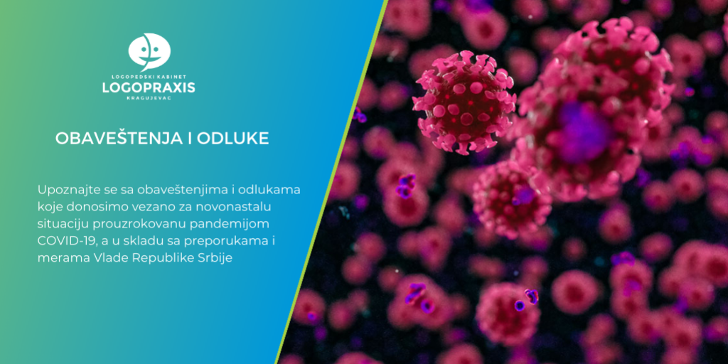 Prateći odluke, mere, instrukcije, naredbe i preporuke Vlade Republike Srbije povodom novonastale situacije sa virusom COVID-19 (korona virus), krizni menadžment Logopedskog kabineta Logopraxis je doneo nekoliko bitnih odluka. Na ovom linku ćemo objavljivati i sve eventualne buduće odluke, radi pravovremenog informisanja zainteresovanih korisnika naših usluga.