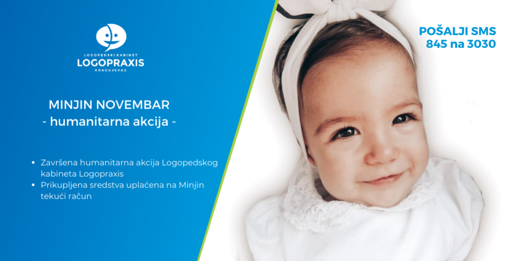 Juče, 30. novembra, završena je humanitarna akcija “Novembar za Minju”, koju je sproveo tročlani logopedskog tima Logopedskog kabineta Logopraxis. Do tog dana, a počev od 10. novembra, usmeravali smo 50% prihoda od logopedskih testiranja i dijagnostičkih pregleda u kutiju za lečenje Minje Matić, naše male sugrađanke i heroine, koja se bori sa opakom bolešću i za čiji lek je potrebna neverovatna suma novca.